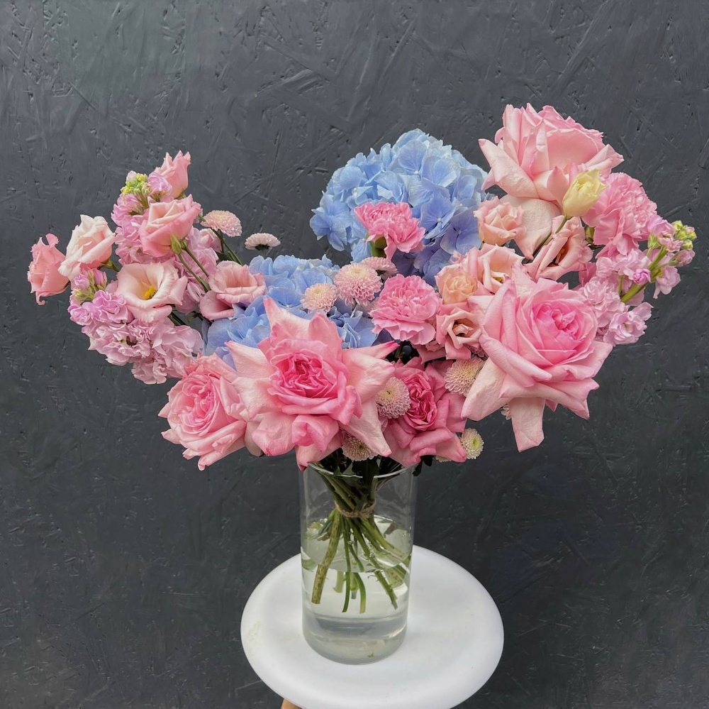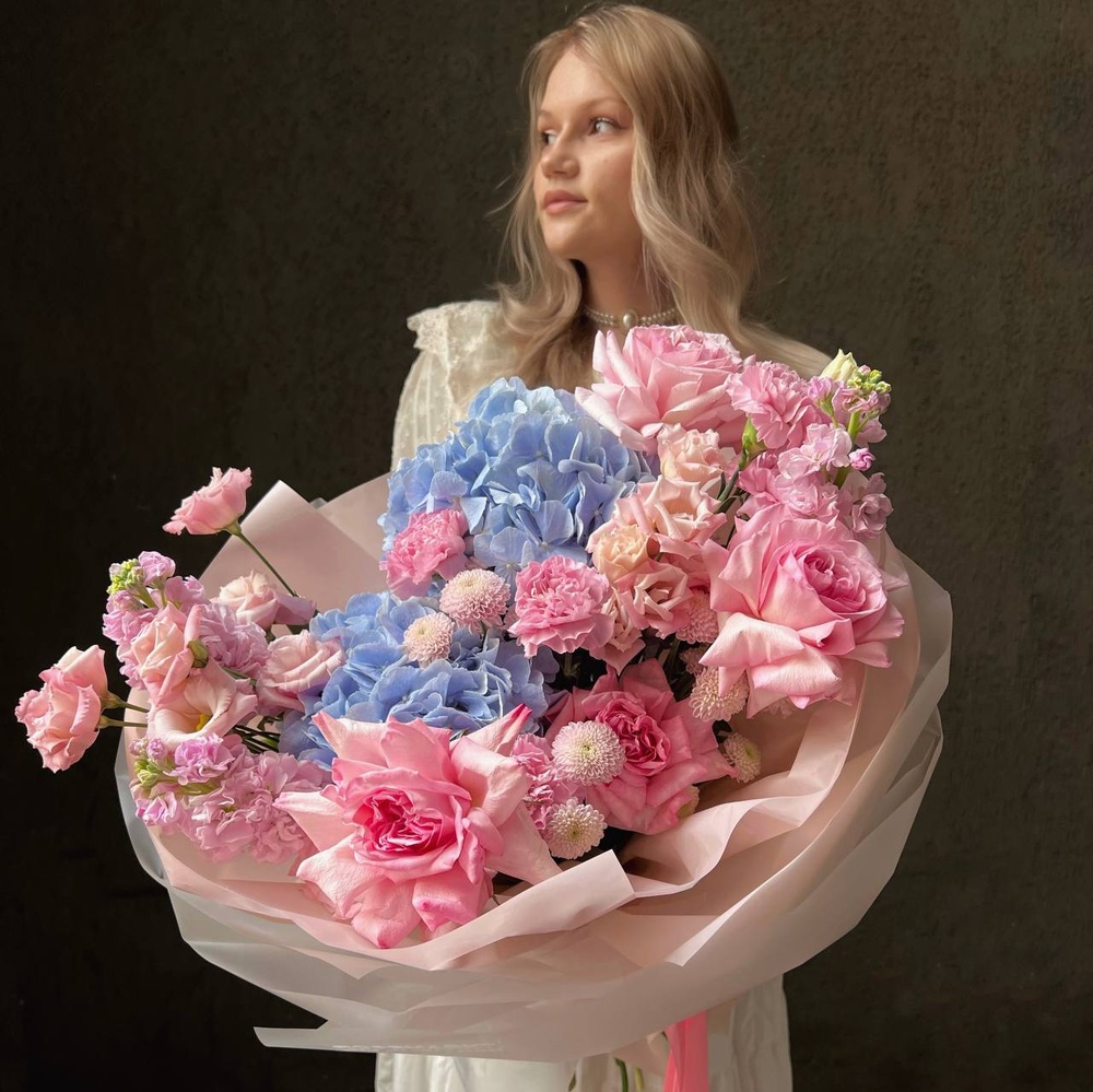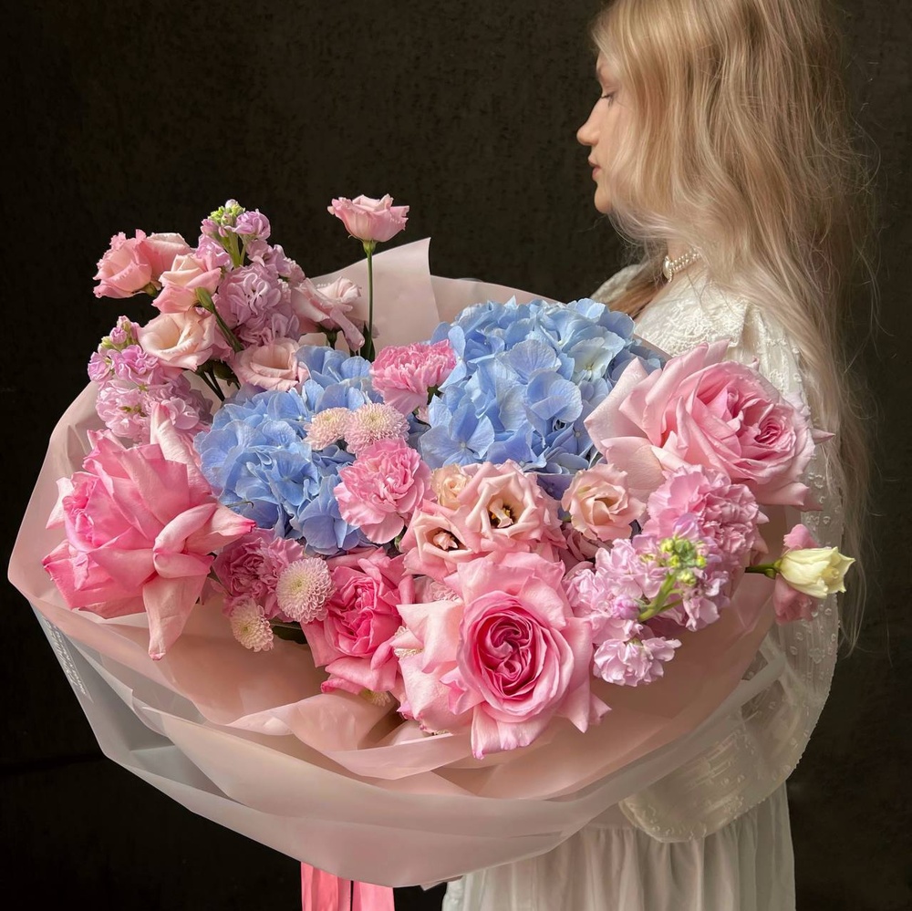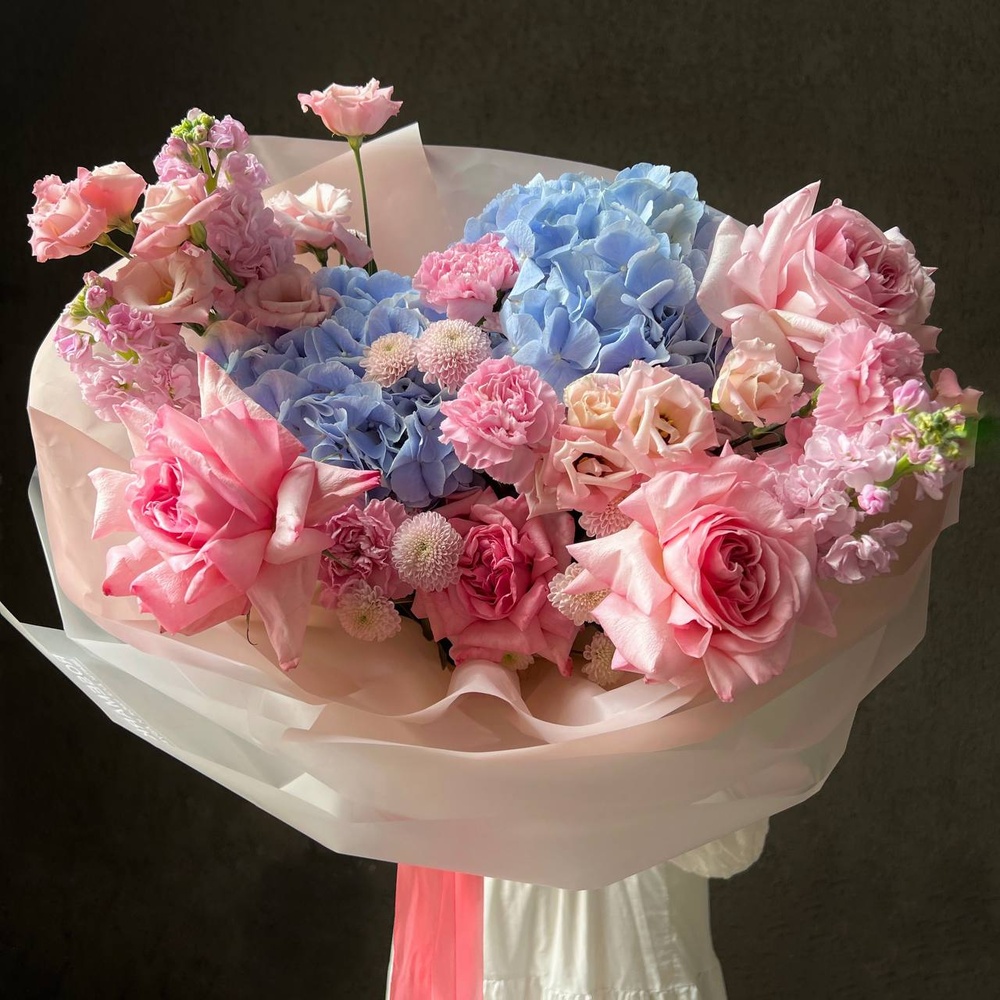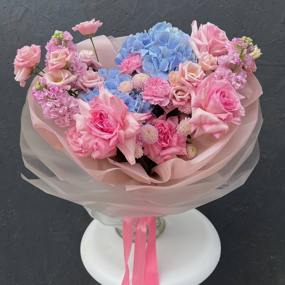 В составе: воздушная гортензия, роза Пинк Охара, кружевной лизиантус, стойкий диантус, хризантема Сантини, ароматная маттиола